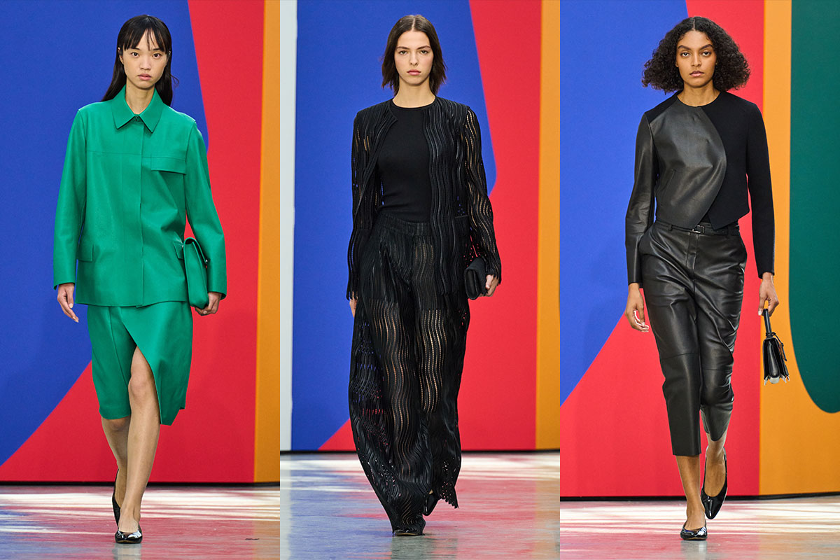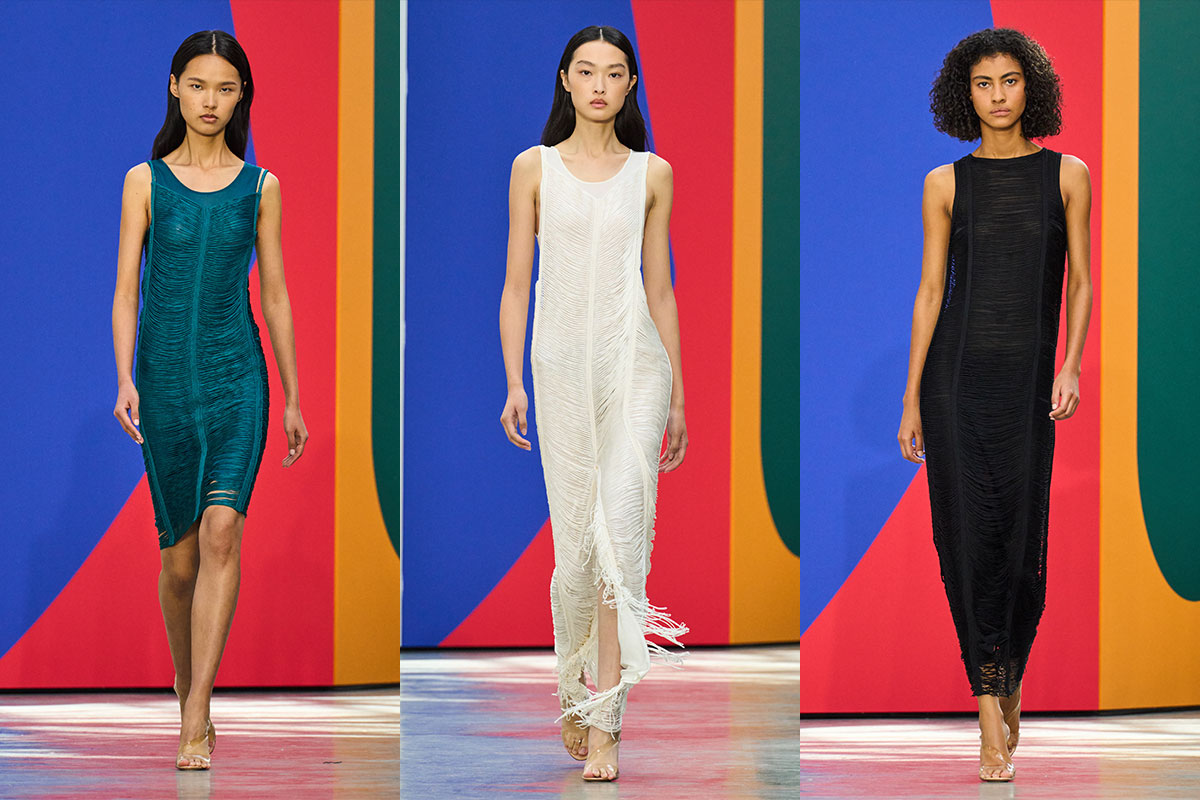 Farbe wird hier zur Architektur. Mutige Paneele aus Seide und Wolle treffen in scharfen Diagonalen aufeinander, ihre Geometrie wird durch Bewegung weichgezeichnet. Horizontale Fransen laufen über Kleider in Smaragd, Weiß und Schwarz – taktile Linien, die sich wie Klangwellen bewegen. Es gibt eine Leichtigkeit in der Konstruktion: Nähte lösen sich in Linien auf, Drapierungen folgen dem Instinkt statt der Designlogik. Das Ergebnis wirkt klug, aber nie verkopft: kontrolliert, doch nie kühl.