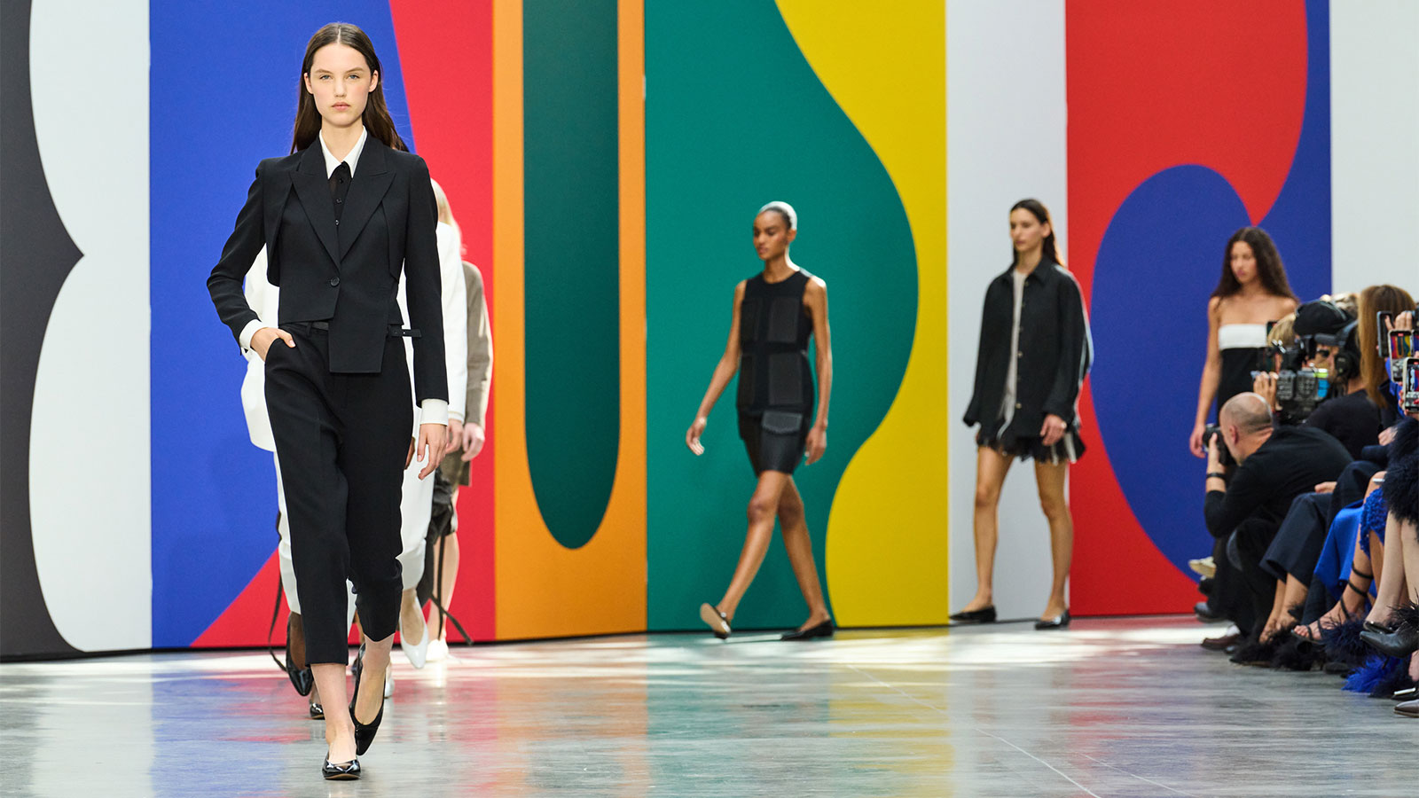 Farbe wird hier zur Architektur. Mutige Paneele aus Seide und Wolle treffen in scharfen Diagonalen aufeinander, ihre Geometrie wird durch Bewegung weichgezeichnet. Horizontale Fransen laufen über Kleider in Smaragd, Weiß und Schwarz – taktile Linien, die sich wie Klangwellen bewegen. Es gibt eine Leichtigkeit in der Konstruktion: Nähte lösen sich in Linien auf, Drapierungen folgen dem Instinkt statt der Designlogik. Das Ergebnis wirkt klug, aber nie verkopft: kontrolliert, doch nie kühl.