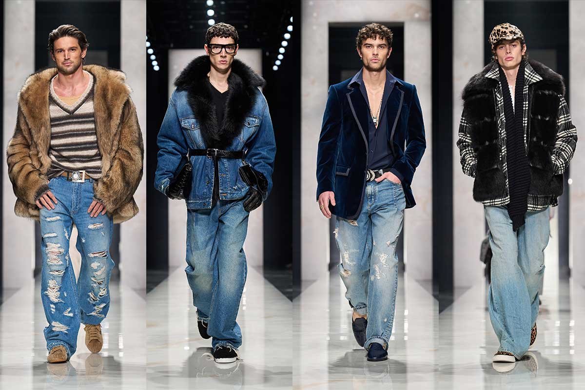 Distressed Denim zeigt sich unapologetisch – zerrissen, stonewashed, stark abgenutzt. Durch Kontraste aufgewertet und in Kombination mit Schneiderkunst, Kunstfell und Samt unterstreicht es die Autorität des Hauses, Denim ohne Abstriche in den Bereich des Luxus zu übertragen.