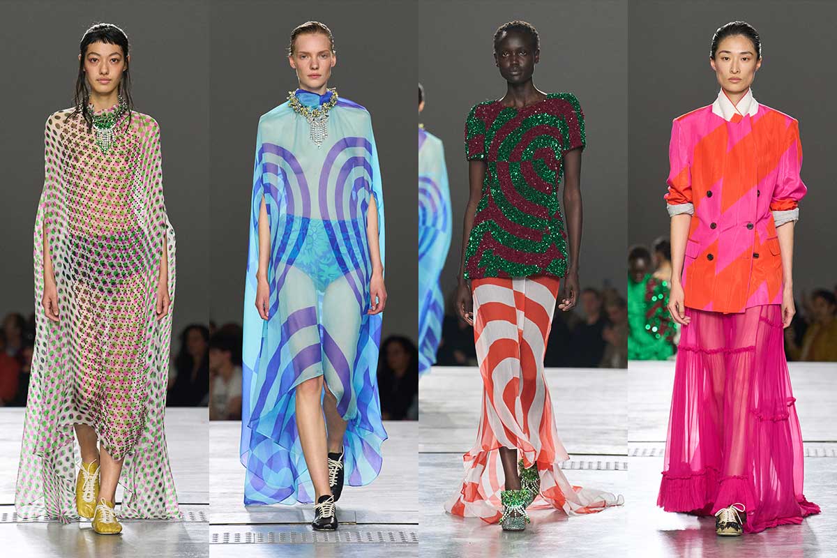 Hier löst Klausner die Bremse. Die Kollektion atmet in Chiffon und hypnotischen Farben. Optische Wirbel, geometrische Wellen und fließende Transparenzen bewegen sich wie flüssiges Licht. Fuchsia trifft auf Mandarine, Jade auf Rot, Türkis auf Violett. Mutige Farbe, wiedergeboren im modernen Rhythmus.