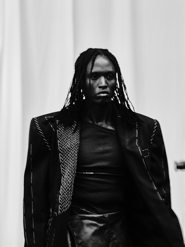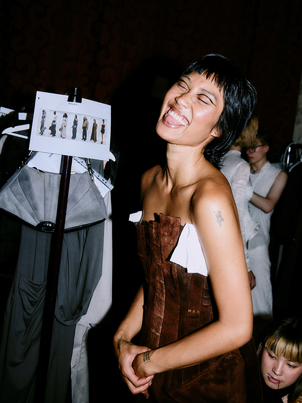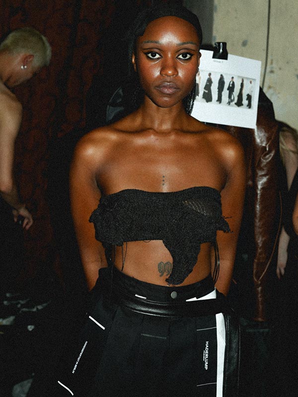 Berlin-Kreuzberg an einem Hitzetag Anfang Juli: Im Künstlergebäude Haus der Visionäre versammeln sich die Fashion-Interessierten der Stadt. Wer nicht weiß, was an diesem Mittwoch passiert, könnte meinen, das Berghain hätte kurzfristig seinen Standort verlegt. Denn auch drückende 35 Grad halten echte Haderlump-Fans nicht davon ab, mehrheitlich schwarz und in mehreren Schichten gekleidet aufzutauchen. Wo man hinsieht, stechen durchdachte, vorwiegend dunkle Outfits mit Schnürungen, Sonnenbrillen, voluminösen und asymmetrischen Schnitte ins Auge. Das Publikum übersetzt die Haderlump-Ästhetik auf den eigenen Stil und schafft so eine harmonische Einheit an modebewussten IndividualistInnen. „An unseren ersten Shows hatten wir zwar auch schon um die 700 Gäste, doch etwa 80 Prozent davon kamen aus unserem Umfeld“, sagt Julius. Im Publikum sitzen nun längst nicht mehr nur Friends and Family. Presse, InfluencerInnen, sogenannte Industry Professionals schnappen sich die Sitze in der ersten Reihe, um einen ganz genauen Blick auf die neue Kollektion werfen zu können. Das Publikum ist so divers wie die Models, die für Haderlump laufen. So tummelt sich beispielsweise auch der ikonische Berghain-Türsteher Sven Marquardt unter den Gästen. Vor der Show wird fleißig posiert, gefilmt und fotografiert. Das Resultat? Noch Tage nach der Show sind Instagram und Co. geflutet mit Bild- und Videomaterial von „Ex Libris“, das nicht nur von Internetpersönlichkeiten stammt, sondern auch von zahlreichen Magazinen und Zeitungen.
