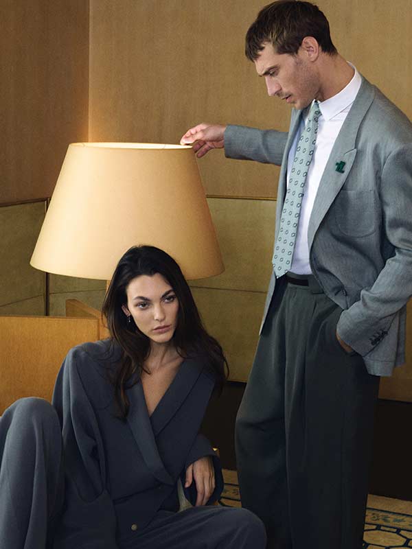Der Fotograf Oliver Hadlee Pearch inszenierte die Topmodels Vittoria Ceretti und Clément Chabernaud in den verschiedenen Räumen der Villa, machte aber auch vom großzügigen Garten Gebrauch. So stehen die beiden zwar im Mittelpunkt, sind dabei jedoch stets von Objekten, Designstücken, Skulpturen und Kunstwerken aus der Sammlung des Maestros umgeben – darunter solche von großen Namen wie Andy Warhol, Francesco Clemente und Antonio Lopez. Neben den ProtagonistInnen sind Aboubakar Conte und Zhaoyi Fan ebenfalls Teil der Kampagne, während Greta Hofer die Giorgio-Armani-Eyewear-Linie präsentiert.