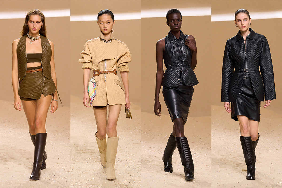 Über Materialmix hinweg: Canvas-Jacken, maßgeschneiderte Lederjacken und Mäntel, taillierte Silhouetten, reitinspirierte Schultern, Lederröcke und Gilets, bei denen gepolsterte Partien auf glatte Flächen treffen. Die Nähte sind präzise, folgen Linien und modellieren Form. Boutis-Steppung erinnert an provenzalisches Kunsthandwerk, neu interpretiert durch modernes Tailoring.