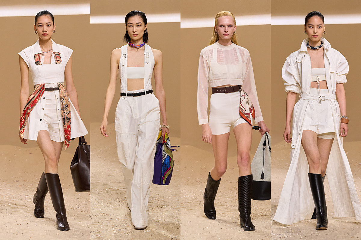 Weiß bekommt durch Proportionen und Schnittführung eine neue Ästhetik. Von Workwear inspirierte Formen – der Fischer-Overall, der Trench, das Hemdblusenkleid – werden mit femininer Präzision neu gedacht. Ledergürtel bringen Form in fließende Silhouetten, Seidentücher und dezente Prints setzen Akzente. Mikroschorts und Croptops geben dem Look Struktur und Schärfe: Funktion und Form im Gleichgewicht.