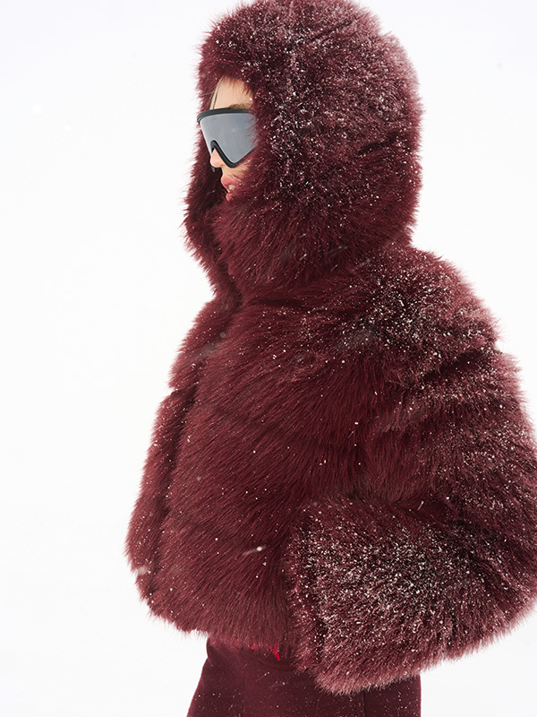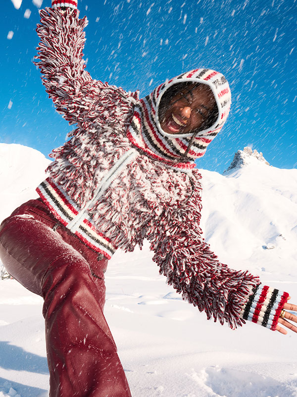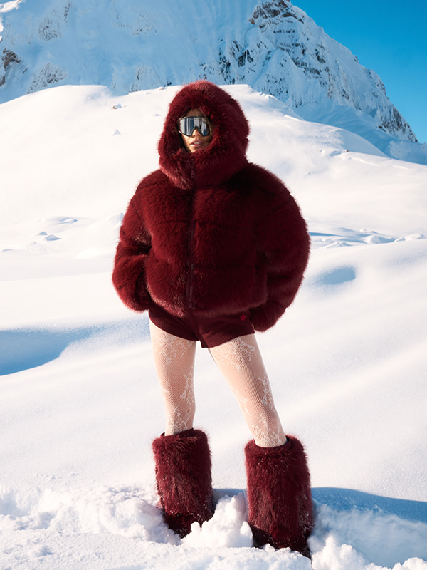 JG: Après-Ski hatte schon immer eine gewisse Energie: entspannt, bequem, gesellig, verspielt und glamourös. Gemeinsam haben wir eine Kollektion geschaffen, die den Geist beider Marken zum Leben erweckt. Die Stücke sind jung, verspielt, sportlich und gesellig, mit einem winterlichen Herzschlag und einer Anspielung auf die Berge, passen aber genauso gut in die Stadt. Die Stoffe sind taktil – von Kunstfell, Leder, Mohair und weicher Merinowolle bis hin zu Nylon – und bieten ausreichend Funktionalität, um sich mühelos anzufühlen.
