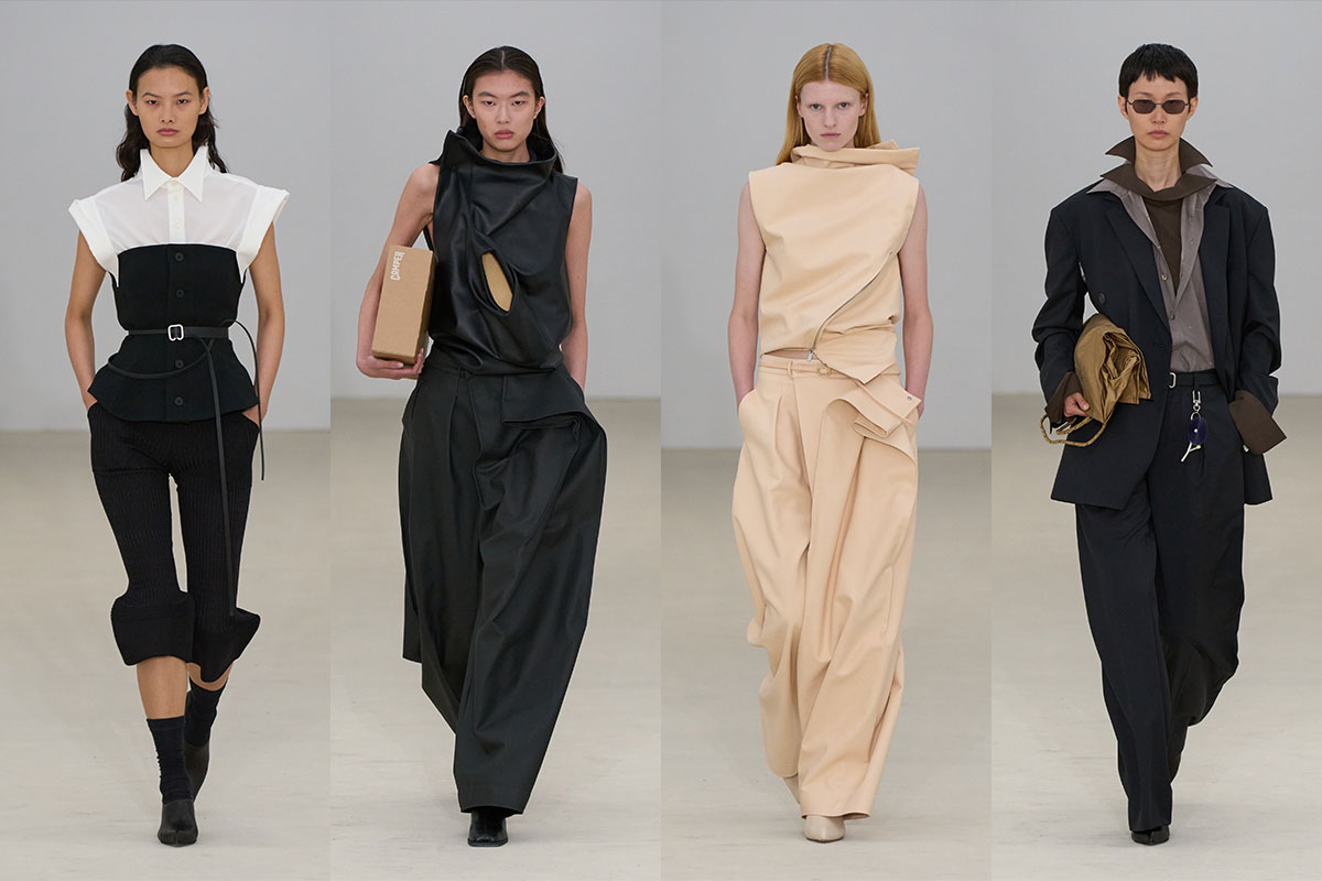 Die Entwürfe verzerren das Vertraute: Poloshirts wölben sich zu fremdartigen Silhouetten, pastellfarbenes Tailoring bricht in skulpturale Asymmetrie, und Lagen scheinen sich im Gehen neu zu ordnen. Anatomie wird neu definiert: Jacken wachsen zusätzliche Gliedmaßen, Ärmel wandern, Futter verlangt Sichtbarkeit.