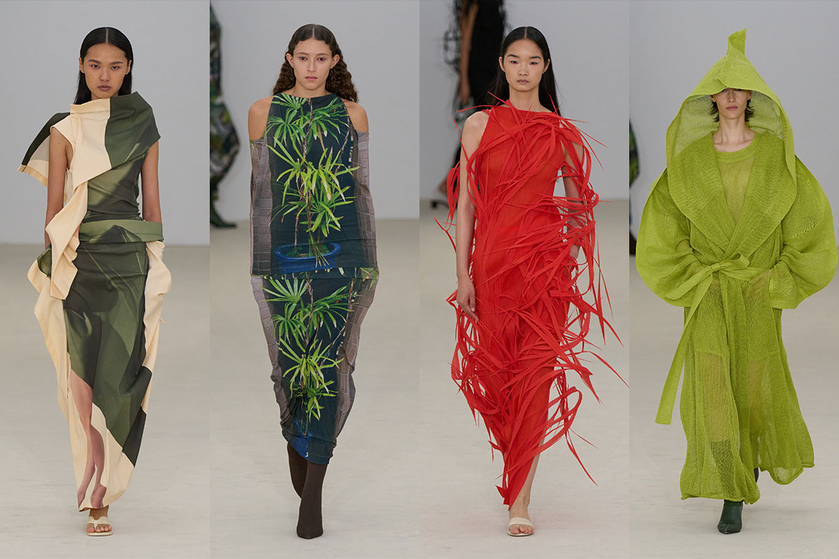 In Shopper’s Body wird Konsum zur Kostümierung; Taschen verschmelzen mit Kleidung, Taschenöffnungen erscheinen dort, wo Logik endet. Urban Jungle und Adventitious verkörpern organische Widerstandskraft: Plissierte Grüntöne erinnern an neues Wachstum, Palmenprints klettern über Säulenkleider, und ein rotes Fransenkleid flattert wie lebendes Korallenriff. Concealed spielt mit dem Raum zwischen Stoff und Körper und zeigt, dass auch Abwesenheit Form haben kann.
