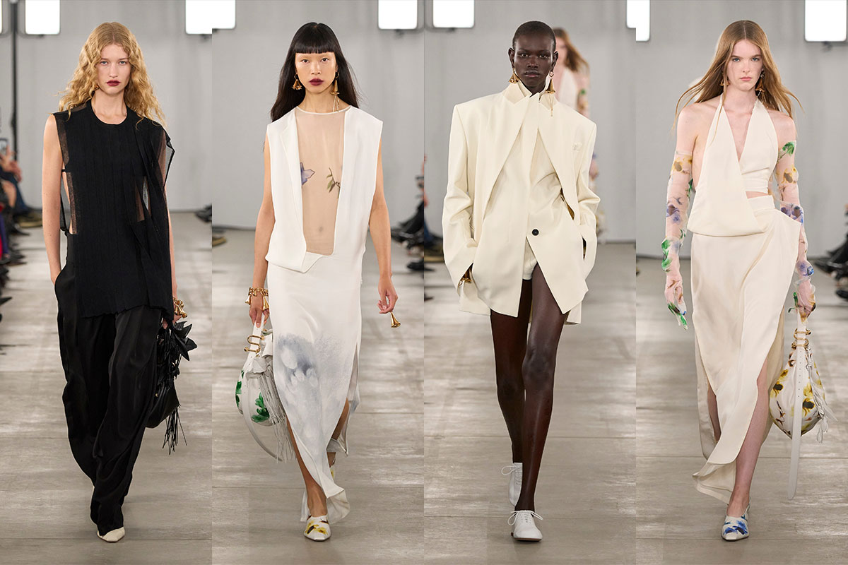 Die Farbpalette reicht von hellen Neutrals bis zu tiefem Burgunder. Ungewöhnlich für den Sommer, aber extrem wirkungsvoll. Schwarz taucht nur sparsam auf, seine Leichtigkeit verstärkt die Stimmung, ohne sie zu stören. Florale Prints, gemalt mit japanischer Kosmetik, schweben in transparenten Schichten wie optische Illusionen. Die Silhouetten bleiben in Balance: architektonische Schnitte treffen auf Hautblitzer, Präzision auf Sinnlichkeit.