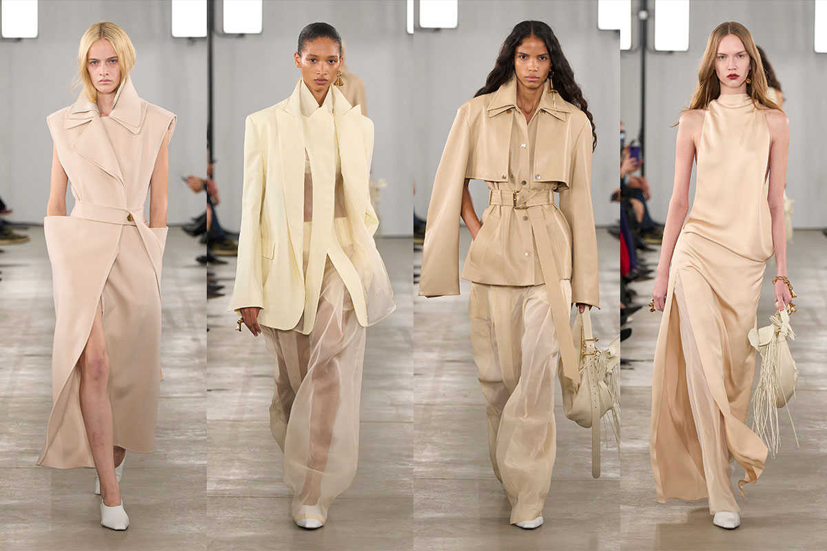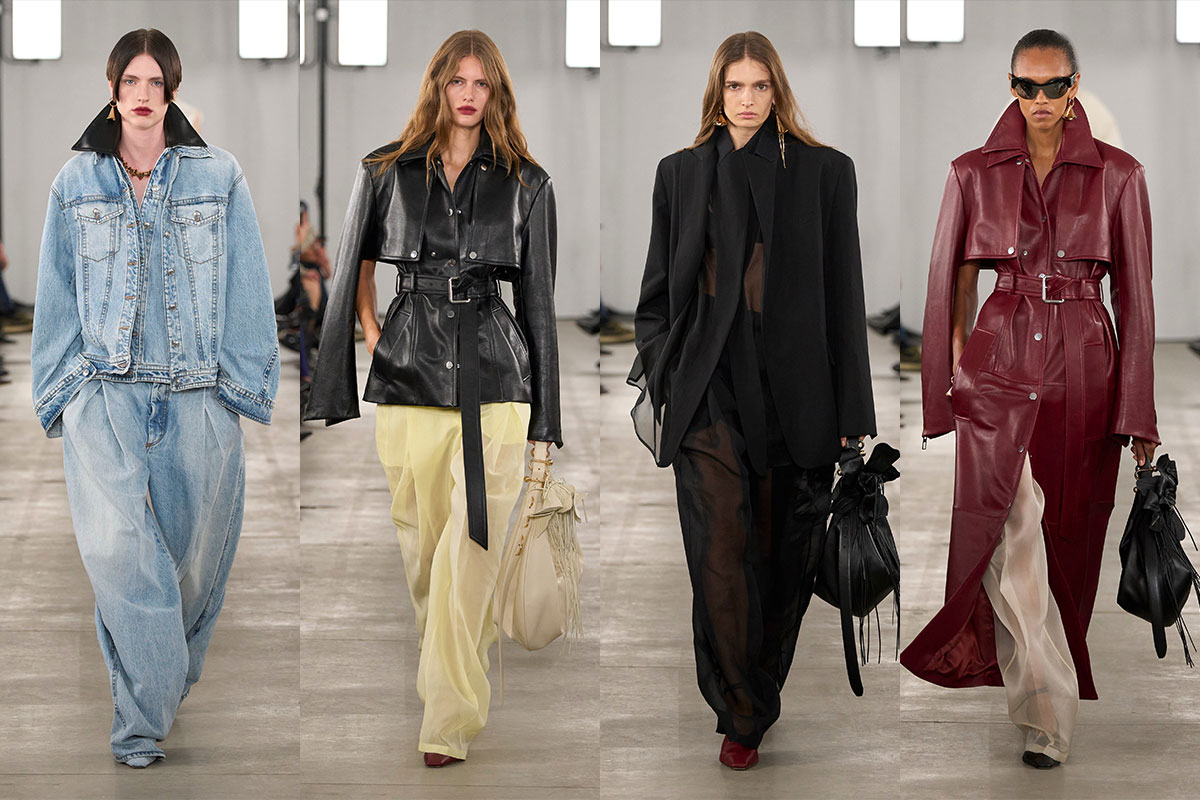 Organza bestimmt die Saison. Nicht mehr bloß Deko, sondern ein echtes Konstruktions-Tool. Trenchcoats bekommen spektrales Volumen, transparente Hosen halten ihre Form, und ultraleichte Futter verändern die Sprache des Tailorings. Satin gleitet als fließende Kleider über den Körper. Leder bringt Struktur in kurze Trenches, lange Mäntel und ärmellose Gilets, während doppelter Denim weich und easy wirkt.