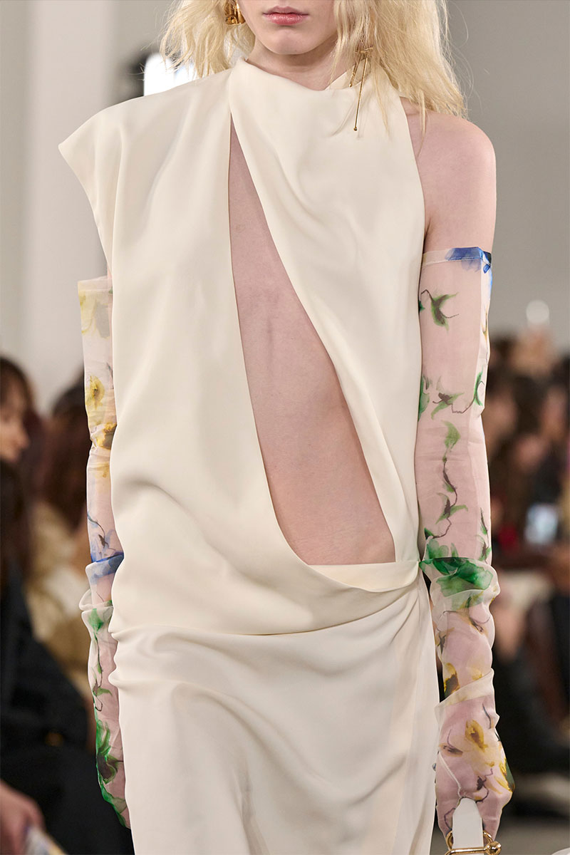 Die Farbpalette reicht von hellen Neutrals bis zu tiefem Burgunder. Ungewöhnlich für den Sommer, aber extrem wirkungsvoll. Schwarz taucht nur sparsam auf, seine Leichtigkeit verstärkt die Stimmung, ohne sie zu stören. Florale Prints, gemalt mit japanischer Kosmetik, schweben in transparenten Schichten wie optische Illusionen. Die Silhouetten bleiben in Balance: architektonische Schnitte treffen auf Hautblitzer, Präzision auf Sinnlichkeit