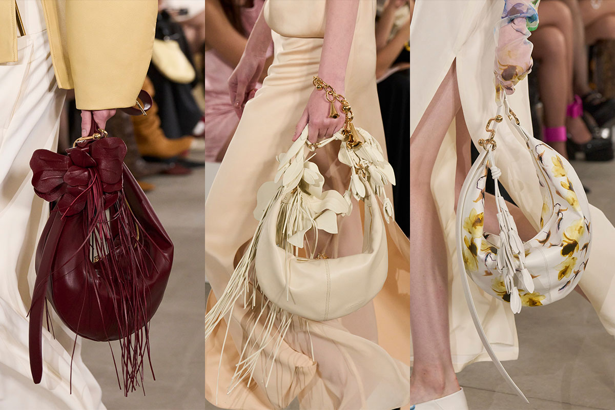 Taschen setzen skulpturale Akzente in Burgunder, Elfenbein und geblümtem Leder, mit Fransen und dreidimensionalen Blüten-Charms.