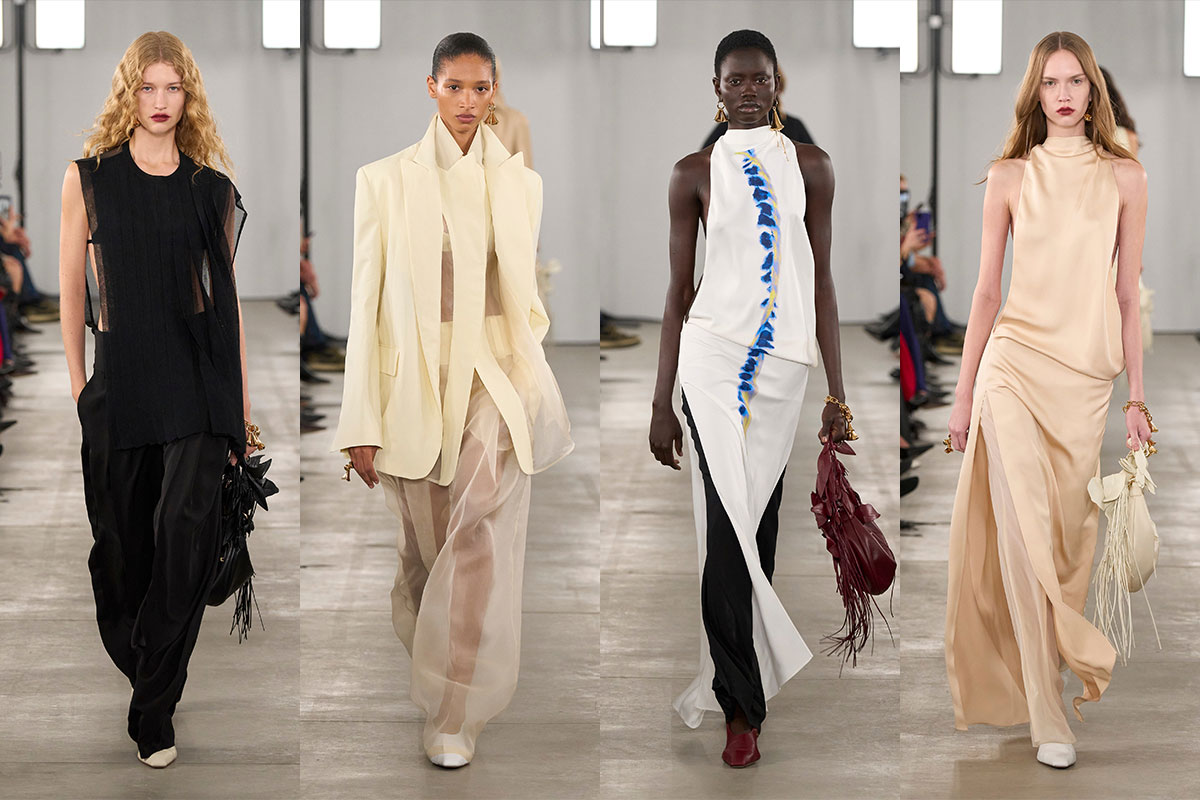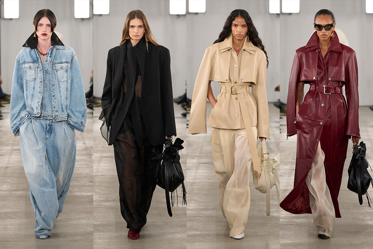 Organza bestimmt die Saison, nicht mehr bloß Deko, sondern ein echtes Konstruktions-Tool. Trenchcoats bekommen spektrales Volumen, transparente Hosen halten ihre Form, und ultraleichte Futter verändern die Sprache des Tailorings. Satin gleitet als fließende Kleider über den Körper. Leder bringt Struktur in kurze Trenches, lange Mäntel und ärmellose Gilets, während doppelter Denim weich und easy wirkt.