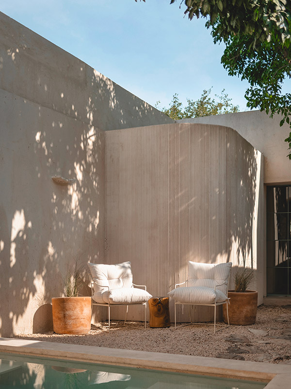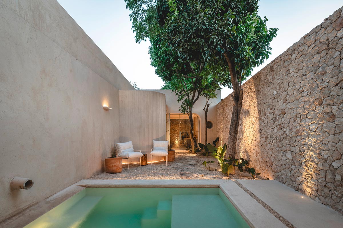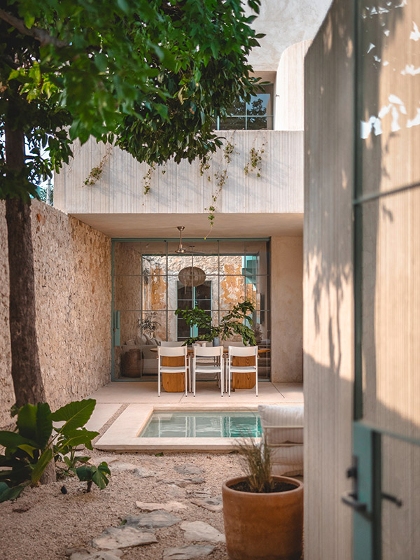 Dass in Mexiko oft die Sonne scheint, kommt dem Projekt zugute, denn wichtige Teile des transformierten Gebäudes liegen im Freien. Etwa 70 Prozent der ursprünglichen Struktur blieb erhalten, was den ökologischen Fußabdruck der Bauarbeiten reduzierte. Die historischen Steinwände erinnern an die Geschichte, während die moderne Einrichtung das Haus in die Zukunft trägt. Ein klares Ziel führte das aufwändige Projekt an: Mehr Licht muss rein. Ein neuer Grundriss teilt das Haus in sechs verschiedene Bereiche – drei überdachte und drei offene. Dabei ist der Übergang zwischen innen und außen fließend. Herzstück des Hauses ist der Innenhof, der auch als passives Kühlelement fungiert. Während PassantInnen in der Hitze schmoren, können die glücklichen BesitzerInnen des Vistalcielo also im Pool entspannen, die Kühle der Steinmauern genießen und den Blick gegen den Himmel richten.