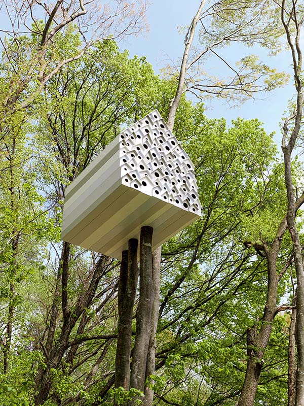 Das Paradies für OrnithologInnen: Drinnen wartet ein gemütliches Bett, draußen locken 350 Vogelhäuschen gefiederte Wesen aller Art an.