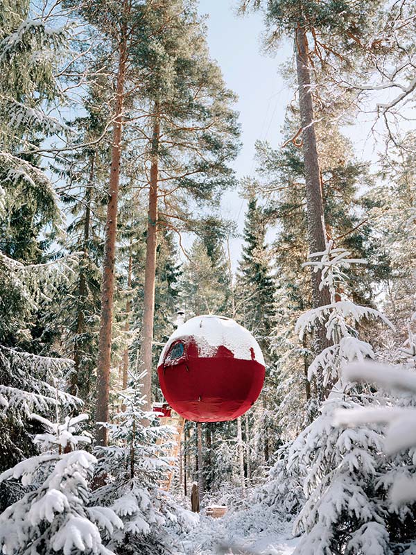 Eine verschneite Weihnachtskugel im Großformat, in der man es sich von Weihnachten bis Neujahr gemütlich machen will.