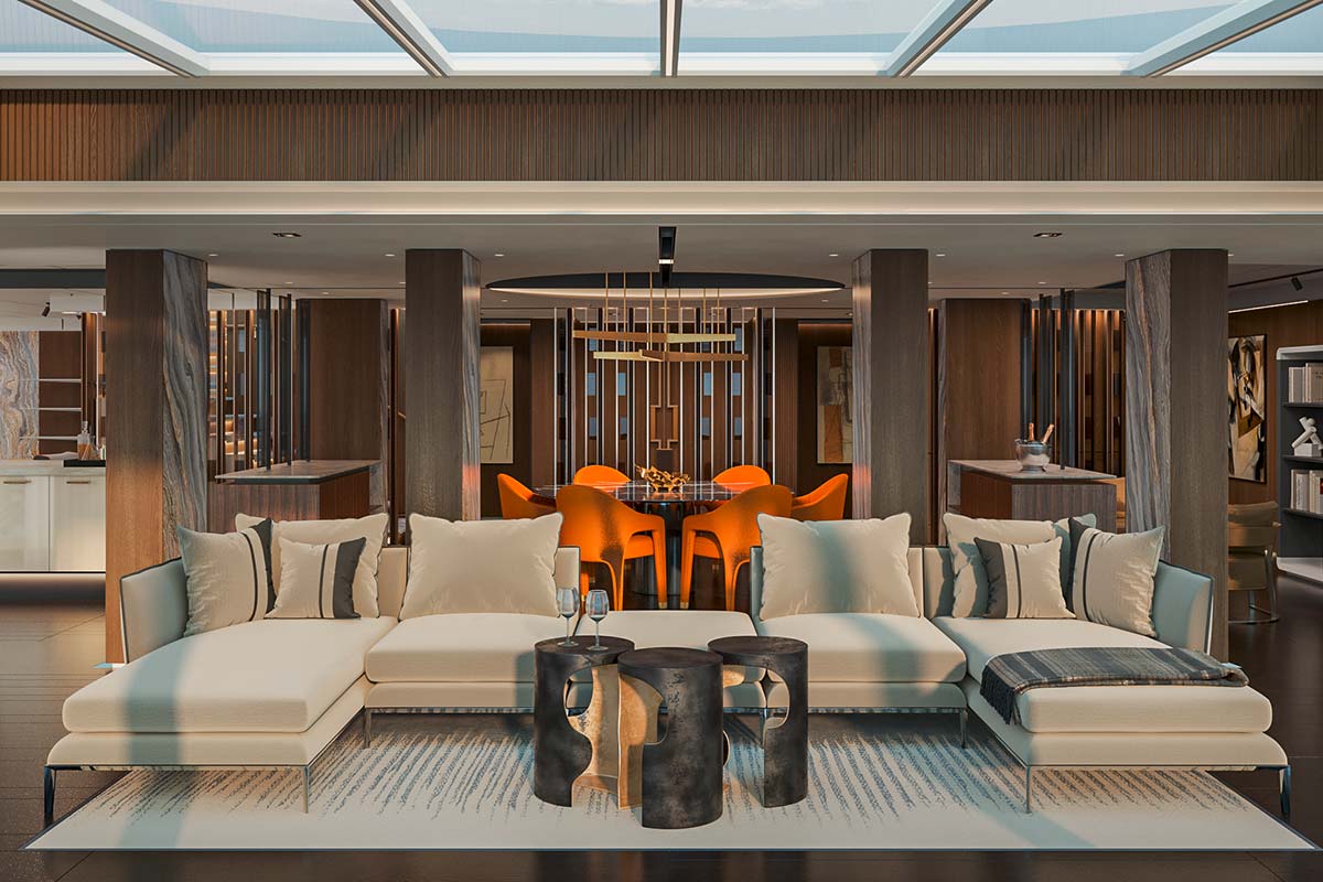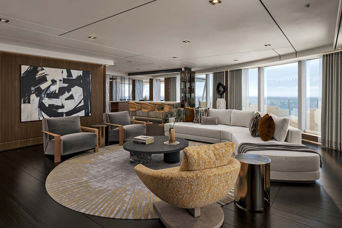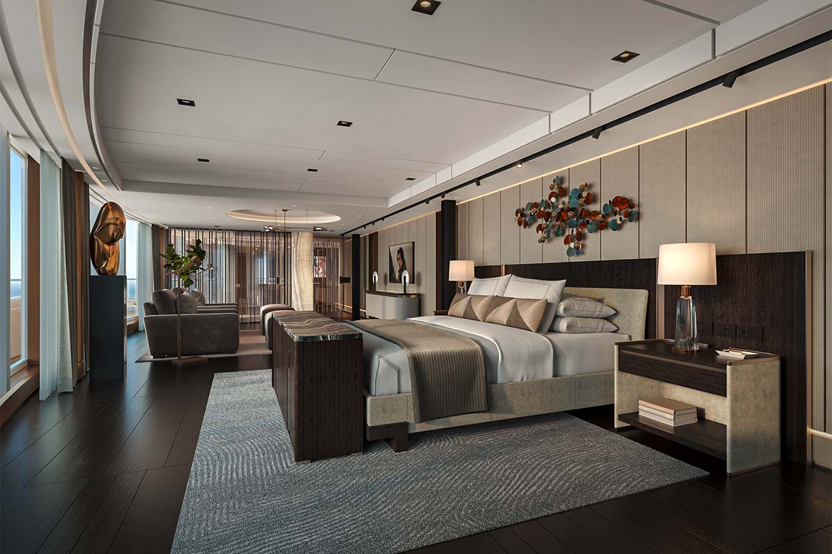 „Mit der Skyview Regent Suite wollten wir die Essenz moderner italienischer Designs einfangen“, sagt Elias Sol von Studio Dado, das für das Design verantwortlich ist. „Klare Linien, exquisite Handwerkskunst und beruhigende Farbwelten schaffen ein unvergleichliches Erlebnis.“